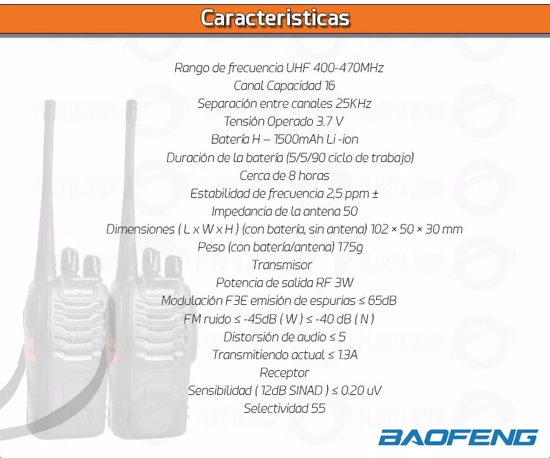 - Separación entre canales: 5/6.25/10/12.5/20/25KHz